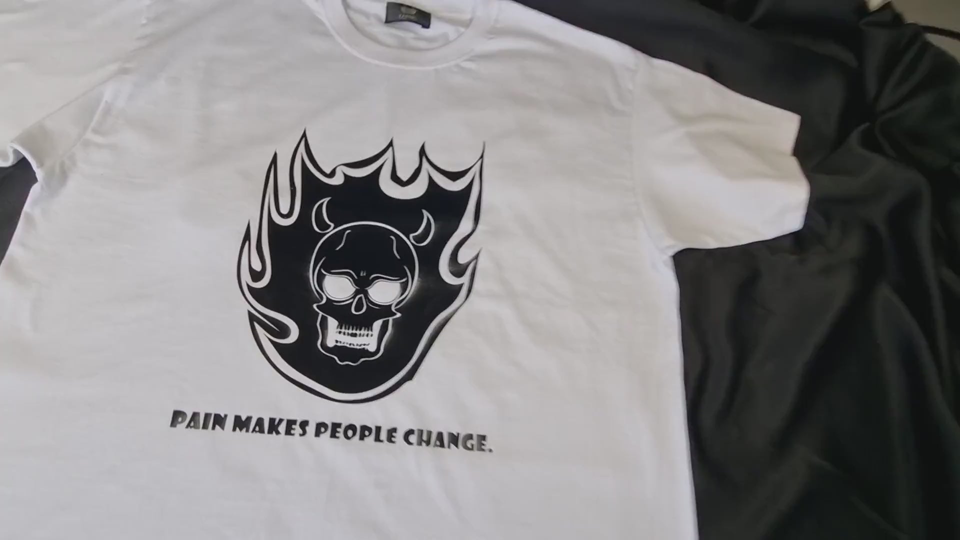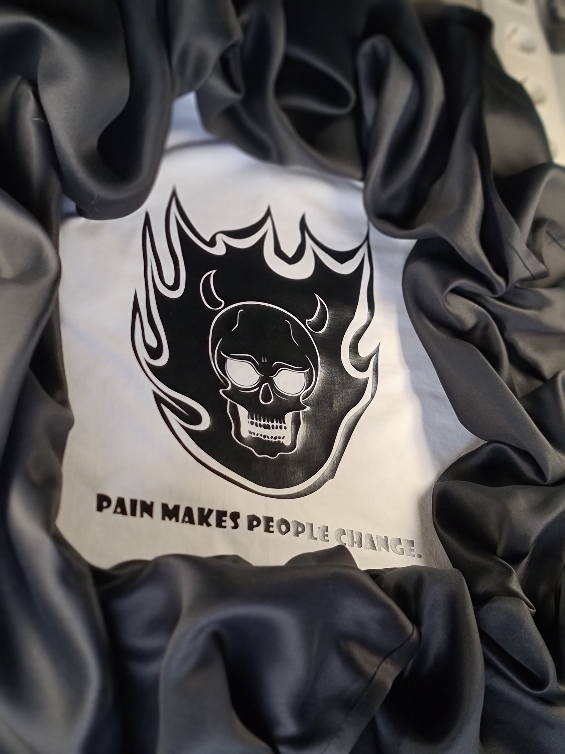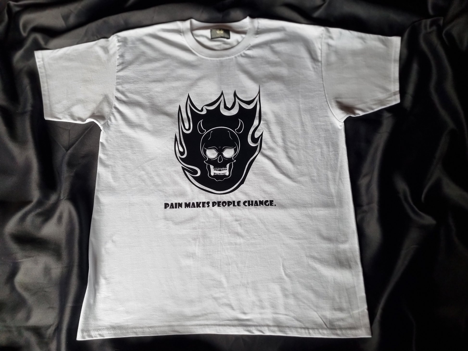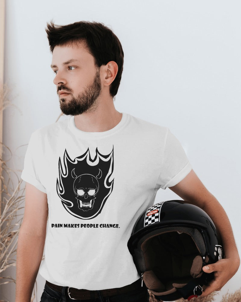 Beneath the striking image lies a powerful message: "Pain makes people change." This profound statement serves as a reminder that adversity can be a catalyst for growth and transformation. Wear it as a symbol of resilience and inner strength, embracing change with every step you take.